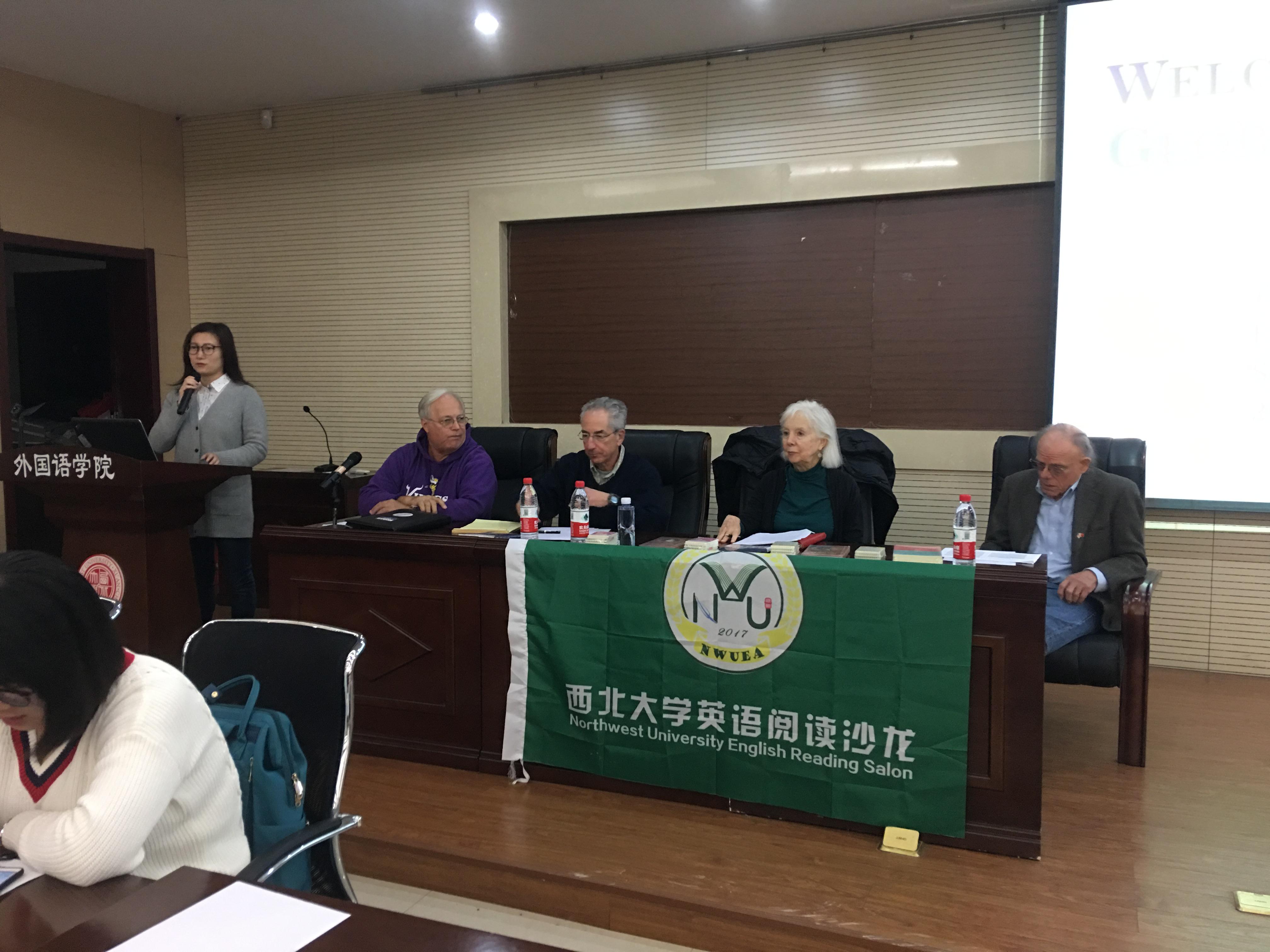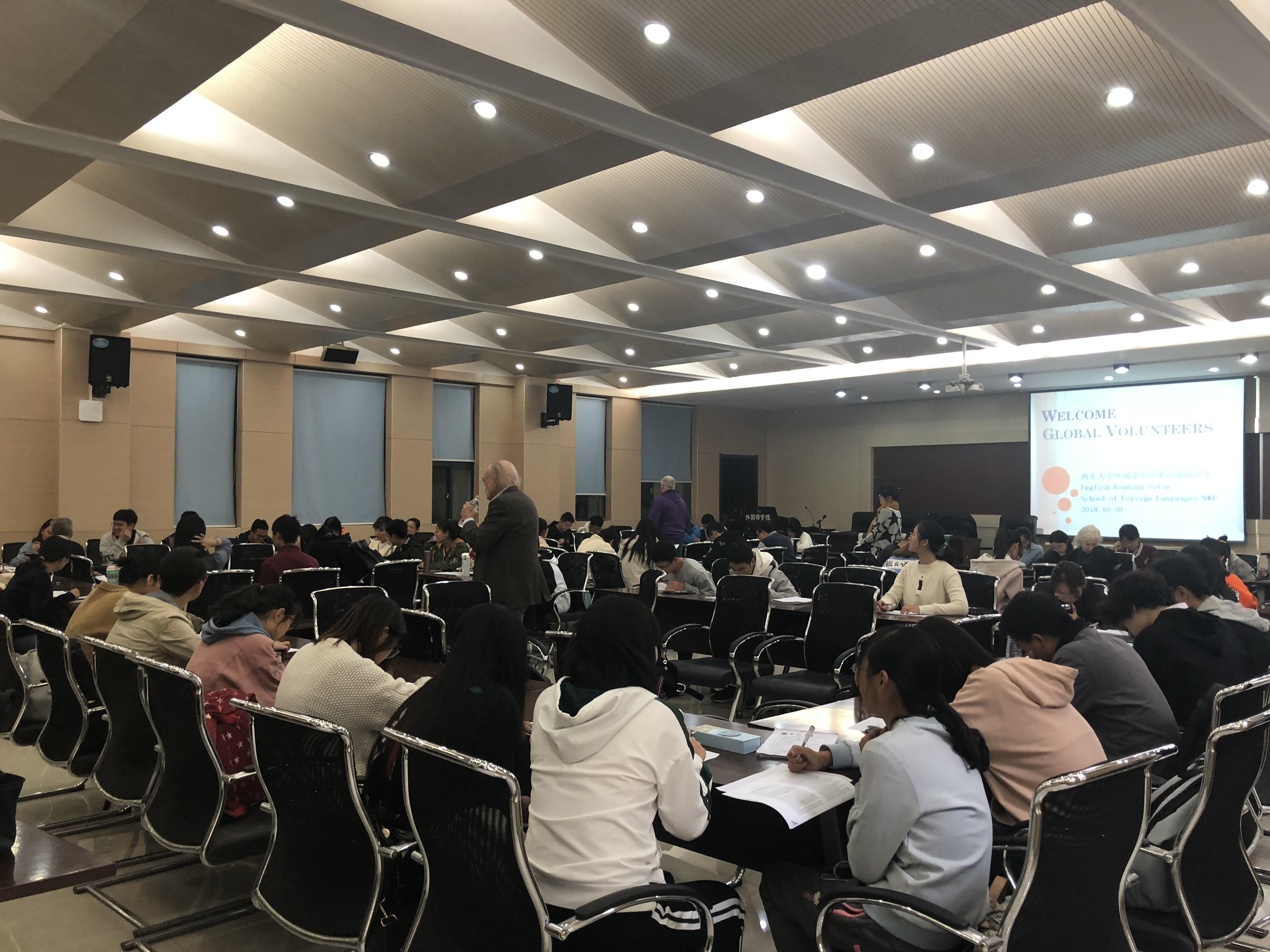 2018年10月30日下午,太阳成集团tyc9728英语读写演讲基地阅读沙龙团队成功举办了“名师导读”英语阅读及读书有感写作比赛活动。活动在太阳成官网四号楼一层高级口译实验室进行,由阅读大赛指导团队负责人张敏老师主持,阅读指导团队石岩老师协助组织,四位美国志愿者应邀和近100位学生参与了活动。