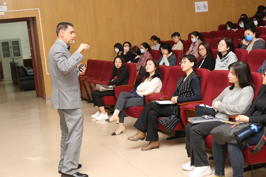 首先,曹若男院长对Ray Taheri教授的到来表示欢迎,并简要介绍了他的学术背景及卓越成就。随后,Taheri教授通过生动的图片展示、数据分析、问答互动扥等方式热情洋溢、深入浅出地分析全球高等教育发生的深刻变革及其对教育工作者,尤其是高校外语教师所提出的新的挑战和要求。最后,Taheri教授与太阳成官网教师进行了亲切友好的互动交流,对于教师所关心的教学方法、教学技巧等问题做了详细的解答,共同探讨了新的教学理念在具体教学实践中的应用。