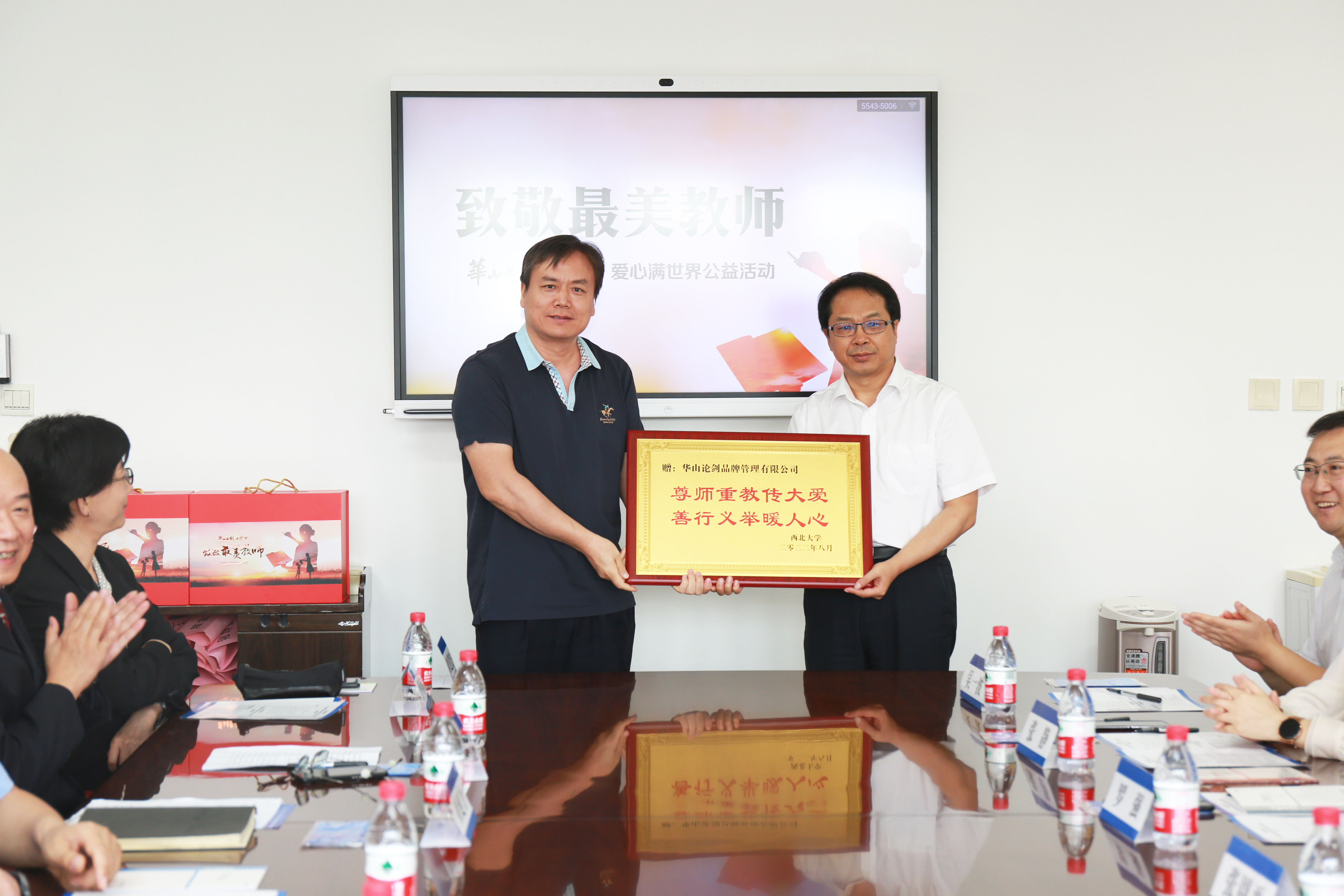 校工会主席田兵权代表学校向华山论剑品牌管理有限公司赠发牌匾。