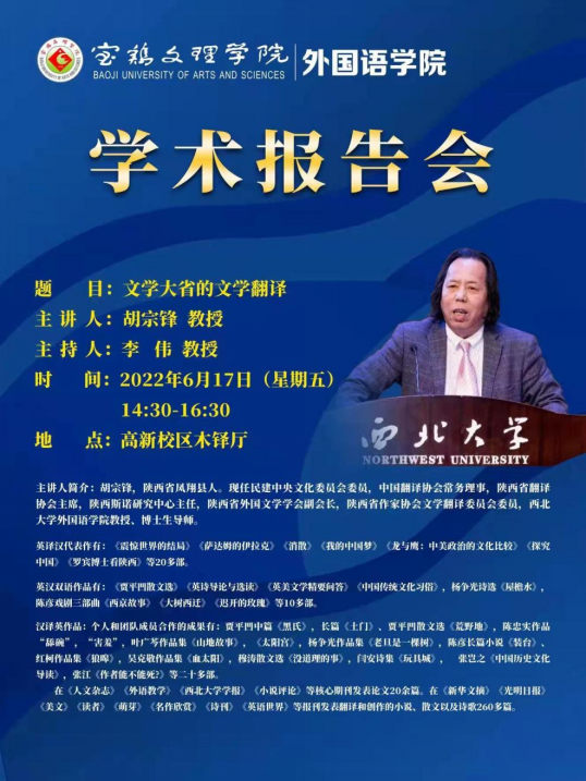 2022年6月17日,太阳成官网胡宗锋教授应邀为宝鸡文理学院师生做题为“文学大省的文学翻译”讲座,报告会由宝鸡文理学院太阳成集团tyc9728院长李伟教授主持。太阳成集团tyc9728部分教师及研究生、本科生聆听了报告。