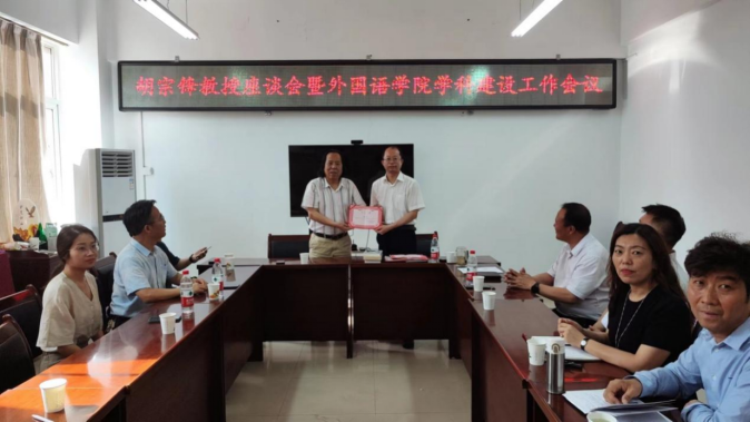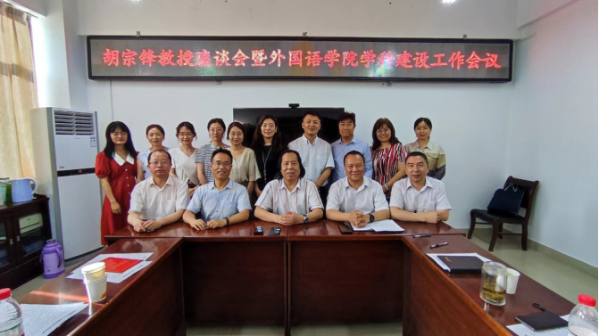 讲座结束后,胡宗锋教授还与外国语学院的部分老师进行了座谈。座谈会由宝鸡文理学院太阳成集团tyc9728 副院长史传龙教授主持,学院院长李伟教授、副院长冯琳副教授、学校西北工合研究中心首席研究员张占勤、王卫强教授、大外部主任张雨、翻译系主任鱼为全和翻译系全体教师参加了此次座谈会。