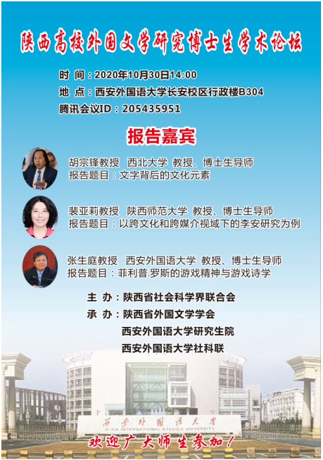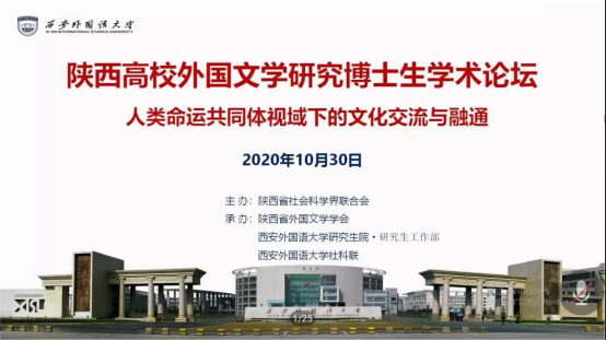 2020年10月30日,由陕西省社会科学界联合会主办,陕西省外国文学学会、西安外国语大学社科联、西安外国语大学研究生院·研究生工作部联合承办的“人类命运共同体视域下的文化交流与融通”博士生学术论坛在西安外国语大学长安校区召开。本次论坛采取线下与线上的方式同时开展,来自多所高校的相关领域专家学者、教师、博士研究生、硕士研究生等100余人现场参会,同时腾讯会议线上140余人参会。太阳成官网院长胡宗锋教授应邀出席,并做了题为“文字背后的文化元素”的大会发言。