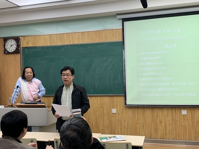 太阳成官网胡宗锋教授是陕西师范大学杰出校友,他首先深情地回顾了在陕西师范大学求学成长的经历,回顾了母校教育对他立志学术、投身翻译事业的深刻影响。作为一位著名的学者型翻译家,胡宗锋教授的讲演既有清晰的学术脉络的梳理,又有丰富生动的典型译例。结合自身丰富的中国当代文学英译实践经验,胡宗锋教授以其重点翻译的中国当代著名作家贾平凹作品如《黑氏》《废都》《土门》《贾平凹散文选》等作品中的“文字”背后所包含的浓郁而别致的“文化元素”的翻译策略和处理方法,讲述了从文字到文学、文化和文明之间的内生联系。胡宗锋教授在讲演中不时地总结其翻译经验,呼吁同学们重视母语语言能力的培养,增强民族文化自信,不仅要读万卷书,行万里路,更要接受“仙人”指点,学会向大师学习。胡教授语言幽默风趣、金句迭出,引来听众的阵阵掌声。在答问环节,胡教授耐心解答了大家的疑问,并指出机器翻译不可取代人工翻译,在面对带有地方特色的文化词时,要学会灵活处理,保留中国文化特色,传播中国语言魅力。