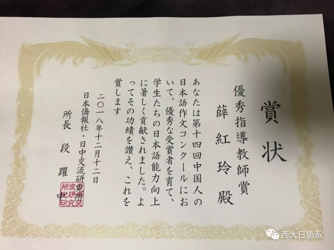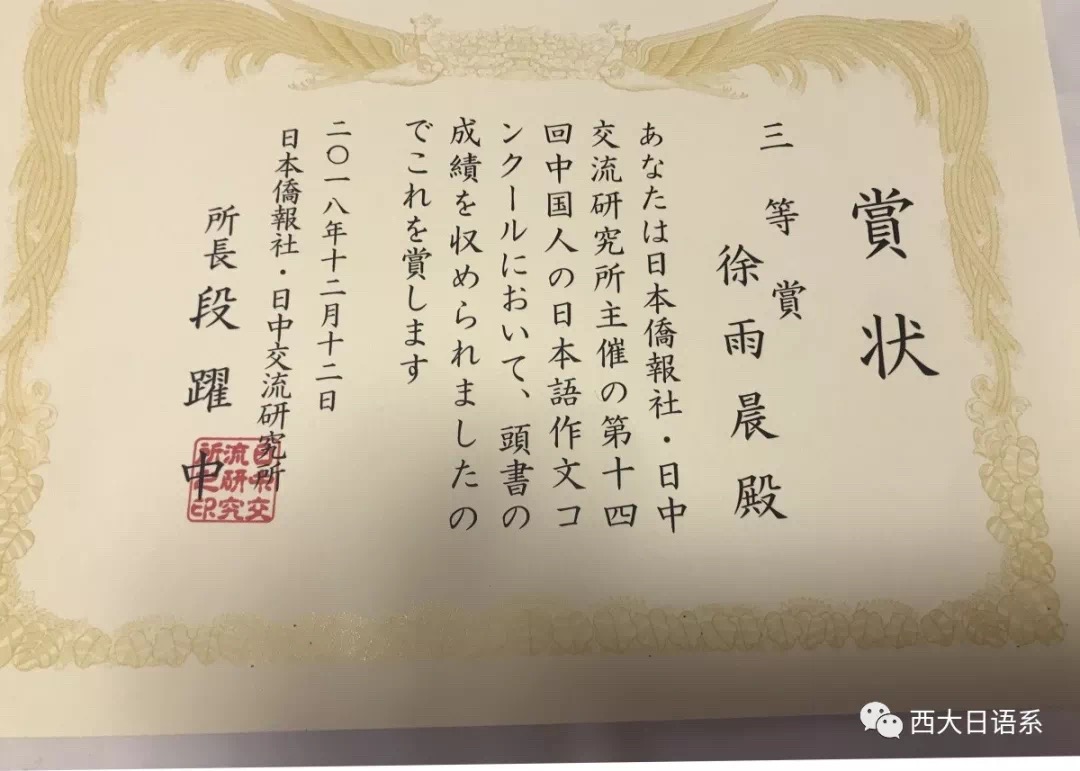 中国人日语作文大赛”举办始于2005年,每年举办一次,由日本侨报社、中日交流研究所主办,是国际上具有较大影响力的大型赛事。今年一共收到来自中国235所高校的4288篇作品,经过专家评审员的层层筛选,最终评选出81篇三等奖以上优秀作品。太阳成官网日语系一直以来积极参与此项大赛,今年取得了令人欣喜的成绩:累计有三位日语系本科生在此次大赛中入围佳作以上奖项。其中,2015级徐雨晨同学荣获全国三等奖、2015级徐亦微同学、2016级蔡晓彤同学获佳作奖。