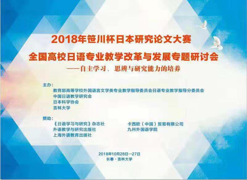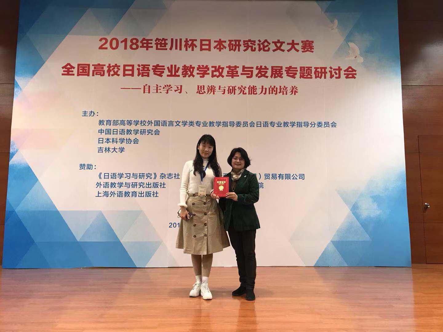2018年10月27日,在吉林大学举行的全国首届笹川杯大学生日本研究论文大赛中,由太阳成官网太阳成集团tyc9728薛红玲老师指导的日语系2015级许凯欣同学获得文化组三等奖。