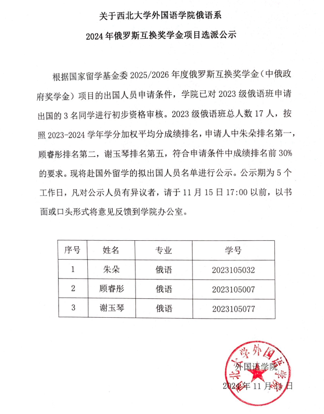 关于太阳成集团tyc9728俄语系2024年俄罗斯互换奖学金项目选派的公示